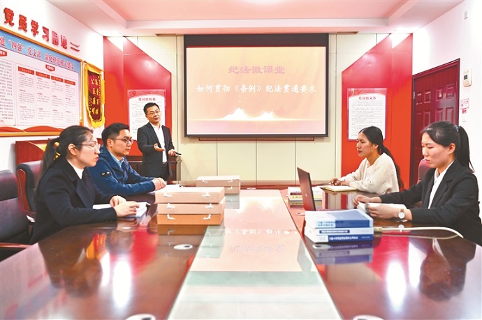 江西省新余市紀(jì)委監(jiān)委不斷強(qiáng)化紀(jì)檢監(jiān)察干部對執(zhí)紀(jì)執(zhí)法貫通理念的理解運(yùn)用,建立“通報講評”機(jī)制,針對實(shí)踐中發(fā)現(xiàn)的難點(diǎn)問題及時分析講解,提升案件辦理質(zhì)效。圖為該市紀(jì)委監(jiān)委案件審理室圍繞新修訂的紀(jì)律處分條例,解讀紀(jì)法銜接條款的理解運(yùn)用。黃磊 攝