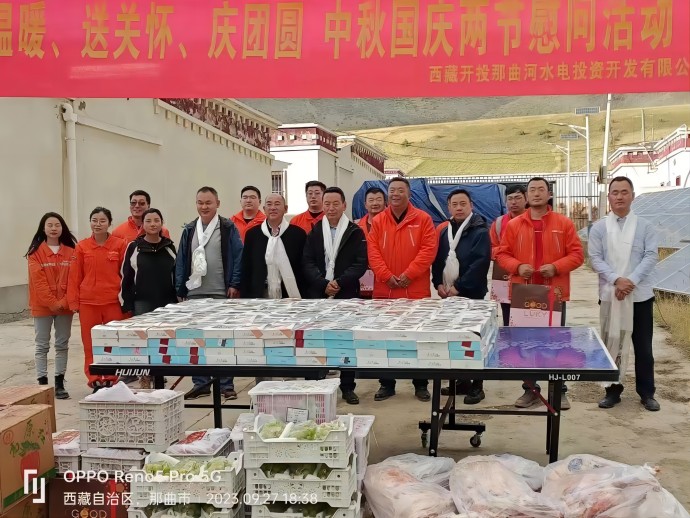 9月27日,西藏開投那曲河水電開發(fā)投資有限公司組織開展送溫暖、送關(guān)懷、慶團(tuán)圓中秋國(guó)慶兩節(jié)慰問活動(dòng),集團(tuán)公司副總經(jīng)理尼瑪出席活動(dòng),那曲河公司總經(jīng)理何驍及其它相關(guān)人員參加。