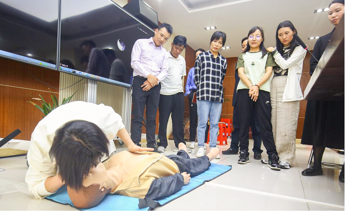 培訓過程中,導師通過示范指導、疑問解答、模擬訓練等方式,著重演示了海姆立克急救法、心肺復蘇操作、防震減災地震自救以及創(chuàng)傷救護等現場救護操作方法,著重強調了應急救護“黃金四分鐘”及心肺復蘇胸外按壓的至關重要性,全體參訓人員在導師的指導下對所學項目進行模擬練習,對不規(guī)范的流程與動作,進行糾正,確保參訓人員真正掌握應急救護技術。