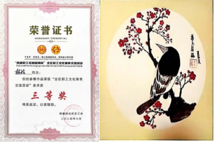 為深入學(xué)習(xí)習(xí)近平新時代中國特色社會主義思想,全面貫徹黨的二十大和二十屆二中、三中全會以及中國工會十八大精神,致敬百年工會歷程,慶祝西藏自治區(qū)成立60周年、中華全國總工會成立100周年,西藏自治區(qū)總工會于今年4月至6月在拉薩舉辦“中國夢·勞動美——凝心鑄魂跟黨走、團(tuán)結(jié)奮斗新征程”“西藏職工互助保障杯”全區(qū)職工文化體育交流活動,并于6月27日在西藏大學(xué)文化藝術(shù)中心舉行了盛大的頒獎儀式。西藏開投集團(tuán)工會會員林玲的作品《喜上眉梢》榮獲三等獎。