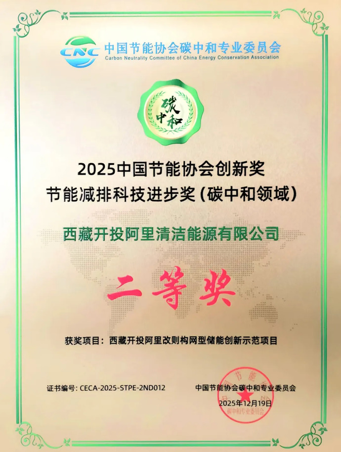 近日,由中國質(zhì)量認(rèn)證中心、中國節(jié)能協(xié)會碳中和專業(yè)委員會聯(lián)合頒發(fā)的2025中國節(jié)能協(xié)會創(chuàng)新獎名單揭曉,由西藏開投阿里清潔能源公司投資建設(shè)的阿里改則構(gòu)網(wǎng)型儲能創(chuàng)新示范項目獲“節(jié)能減排科技進(jìn)步獎(碳中和領(lǐng)域)二等獎”。