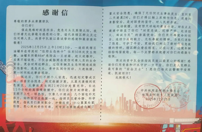 近日,西藏開投旁多水電公司兼職消防隊獲林周縣阿朗鄉(xiāng)黨委、政府授予的錦旗與感謝信,表彰其在一起危化品運輸車輛側(cè)翻事故救援中的突出貢獻。