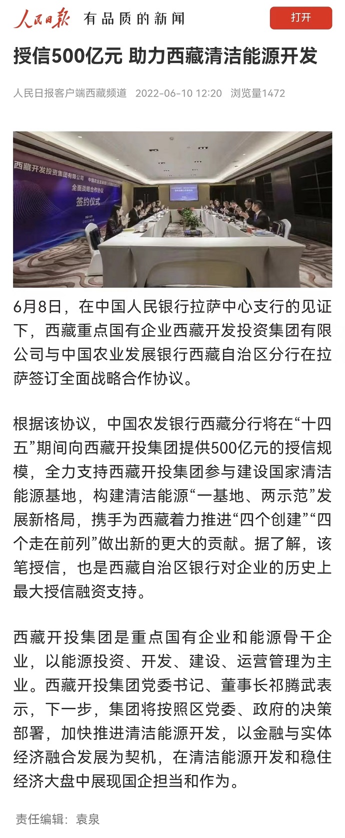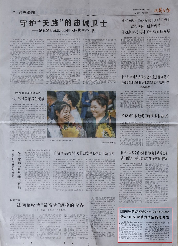 (編者按)6月10日,《人民日報》客戶端西藏頻道報道了《授信500億元 助力西藏清潔能源開發(fā)》?!段鞑厝請蟆?022年6月10日在第2版“高原要聞”欄目刊登文章,報道《授信500億元|西藏開投集團與中國農(nóng)發(fā)行西藏分行簽訂全面戰(zhàn)略合作協(xié)議》。西藏電視臺2022年6月10日在西藏電視臺影視文化頻道《今晚九點》欄目報道了《授信500億元|西藏開投集團與中國農(nóng)發(fā)行西藏分行簽訂全面戰(zhàn)略合作協(xié)議》,《珠峰云》平臺同步播放。新華網(wǎng)、經(jīng)濟日報、西藏衛(wèi)視、西藏日報客戶端、網(wǎng)信西藏、今日頭條等媒體均報道了相關(guān)新聞。全文如下:
