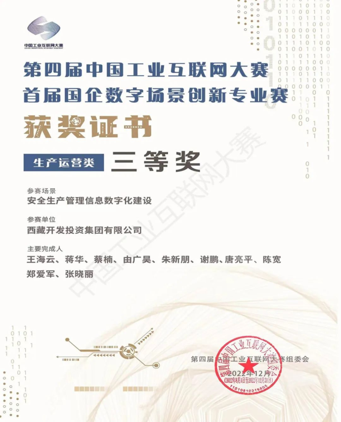 近日,西藏開發(fā)投資集團(tuán)有限公司在國務(wù)院國資委首屆國企數(shù)字場景創(chuàng)新專業(yè)賽中榮獲生產(chǎn)運(yùn)營類三等獎。