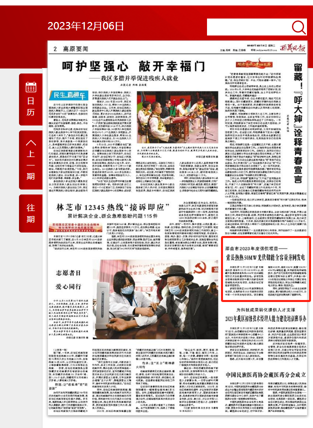 編者按:12月5日,西藏日報第二版高原要聞欄目報道了《那曲市2023年度保供項目—索縣熱熱50MW光伏儲能全容量并網發(fā)電》文章。全文如下: