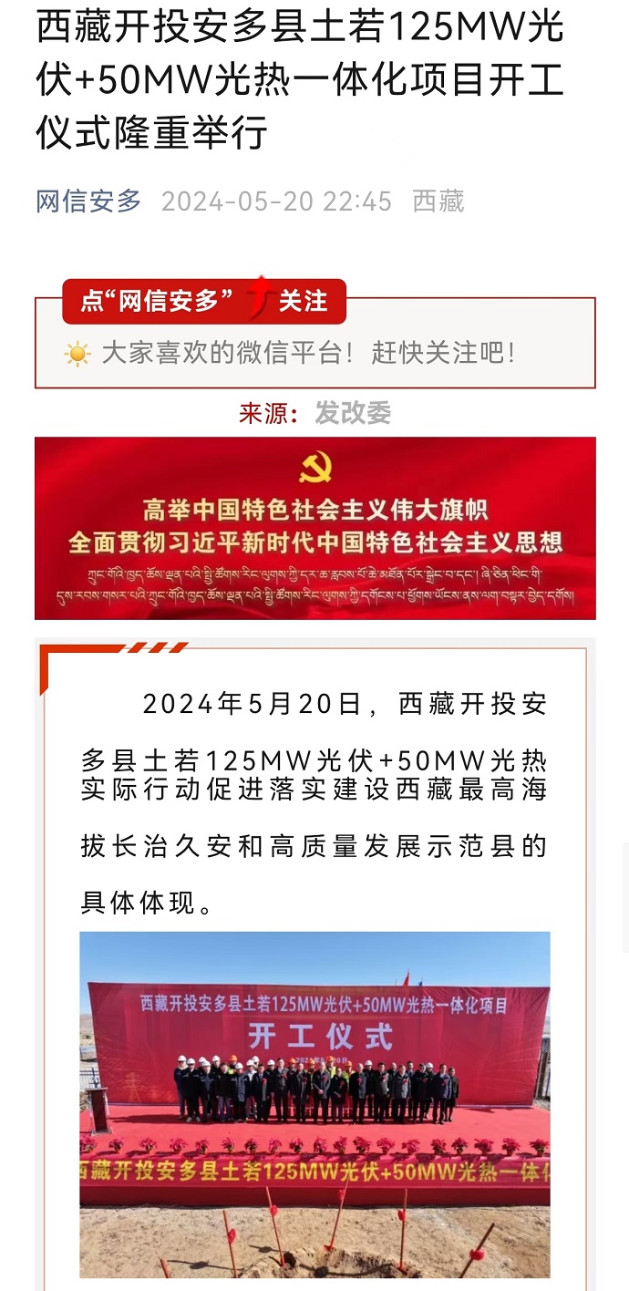 編者按:近日,西藏日?qǐng)?bào)、網(wǎng)信安多等媒體報(bào)道了《那曲市首個(gè)光伏光熱一體化項(xiàng)目開(kāi)工》文章。摘要如下: