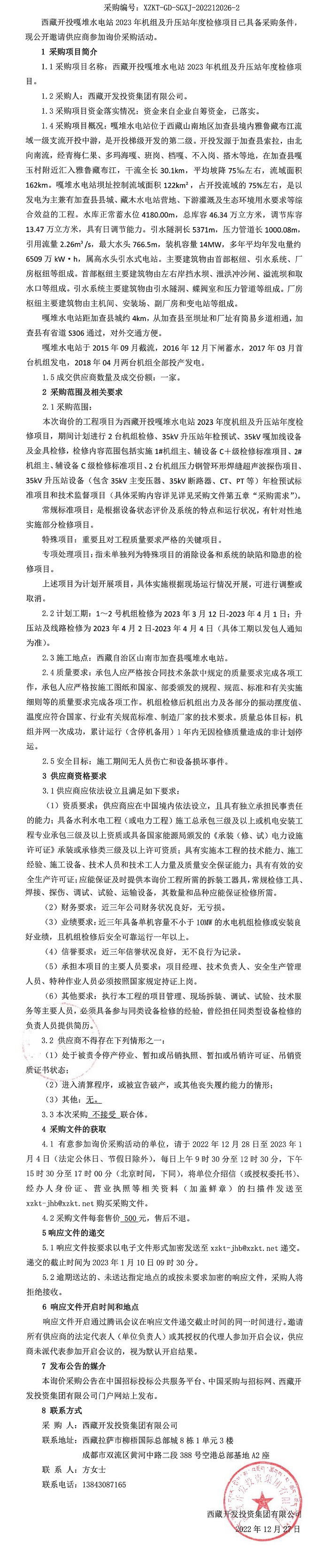 西藏開(kāi)投嘎堆水電站2023年機(jī)組及升壓站年度檢修項(xiàng)目詢價(jià)采購(gòu)二次公告