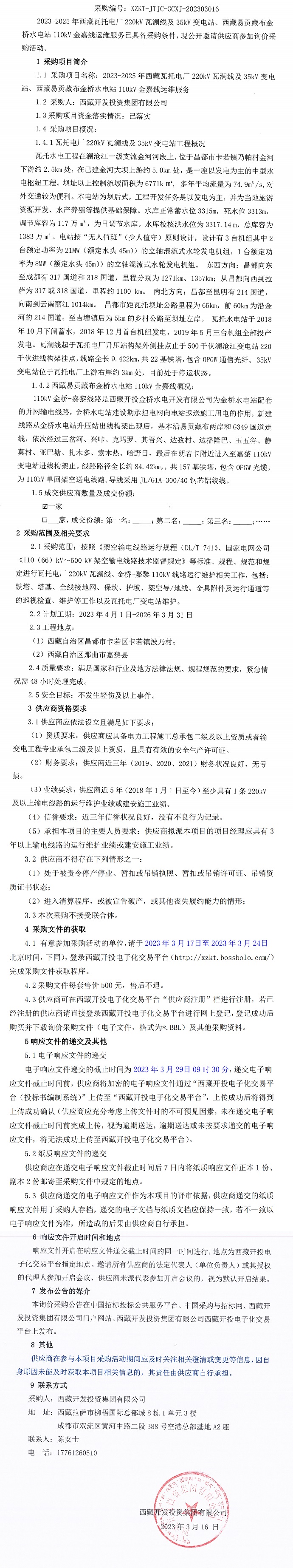 2023-2025年西藏瓦托電廠220kV 瓦瀾線及35kV變電站、西藏易貢藏布金橋水電站 110kV金嘉線運維服務詢價采購公告