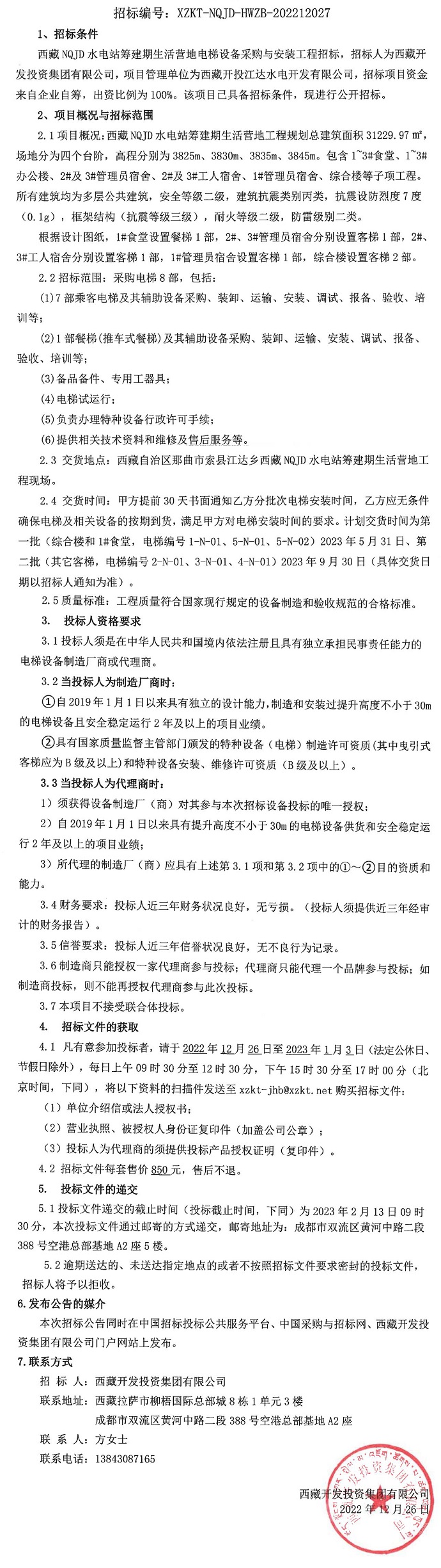 西藏NQJD水電站籌建期生活營(yíng)地電梯設(shè)備采購與安裝工程