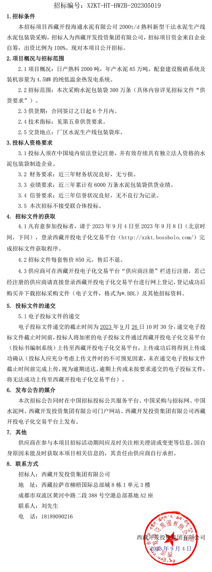 西藏開投海通水泥有限公司2000t/d熟料新型干法水泥生產(chǎn)線水泥包裝袋采購招標公告
