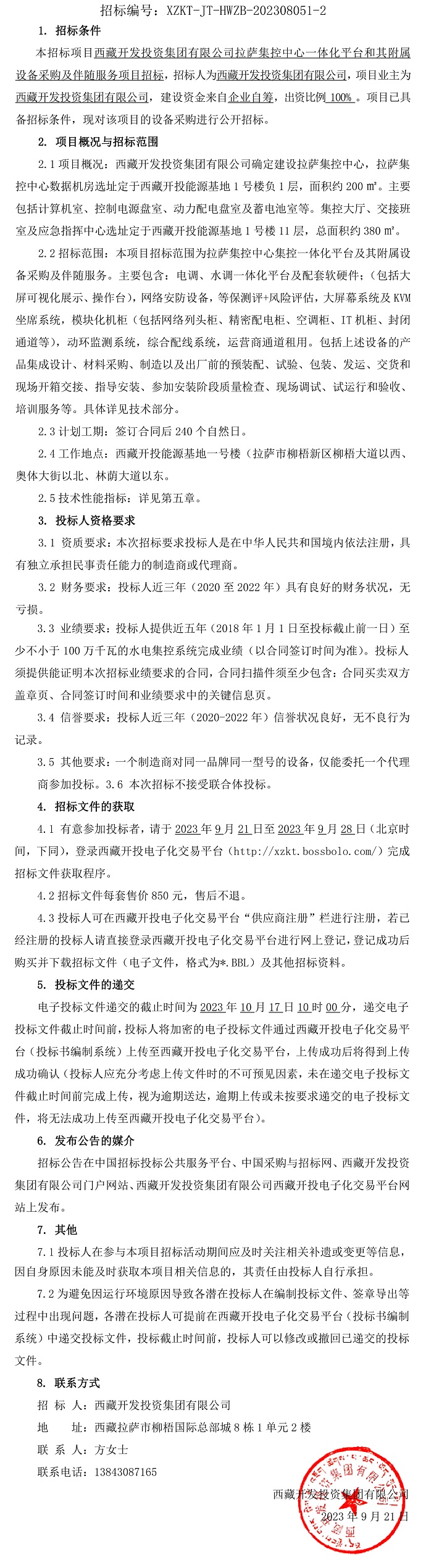 西藏開發(fā)投資集團有限公司拉薩集控中心一體化平臺和其附屬設(shè)備采購及伴隨服務(wù)項目招標(biāo)公告(第二次)