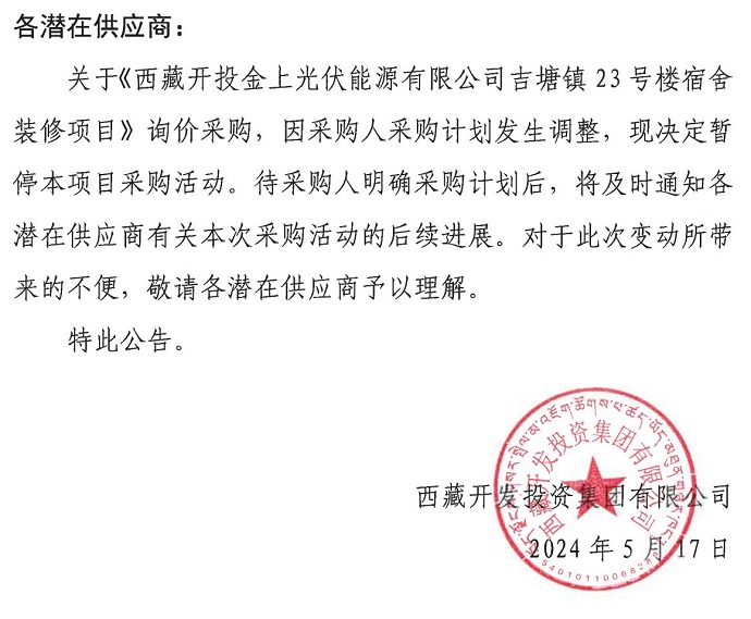 關(guān)于暫停《西藏開(kāi)投金上光伏能源有限公司吉唐鎮(zhèn)23號(hào)樓宿舍裝修項(xiàng)目》詢價(jià)采購(gòu)活動(dòng)的公告