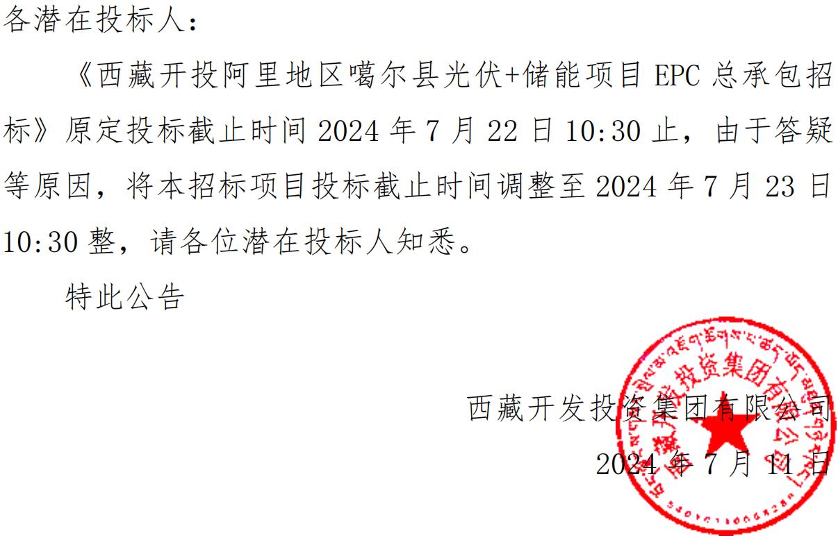 關(guān)于延長(zhǎng)《西藏開投阿里地區(qū)噶爾縣光伏+儲(chǔ) 能項(xiàng)目 EPC 總承包招標(biāo)》投標(biāo)截止時(shí)間的公告
