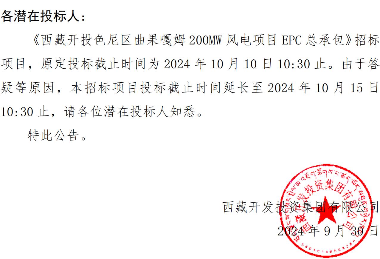 關(guān)于延長(zhǎng)《西藏開投色尼區(qū)曲果嘎姆200MW風(fēng)電項(xiàng)目EPC總承包》投標(biāo)截止時(shí)間的公告