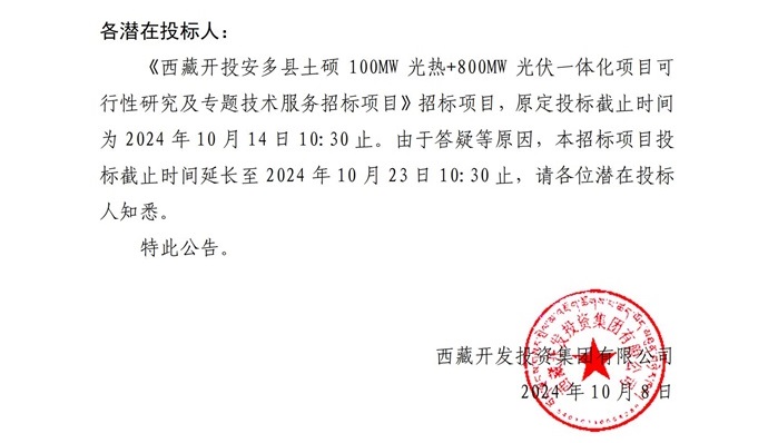 關(guān)于延長《西藏開投安多縣土碩100MW光熱+800MW光伏一體化項(xiàng)目可行性研究及專題技術(shù)服務(wù)招標(biāo)項(xiàng)目》投標(biāo)截止時(shí)間的公告