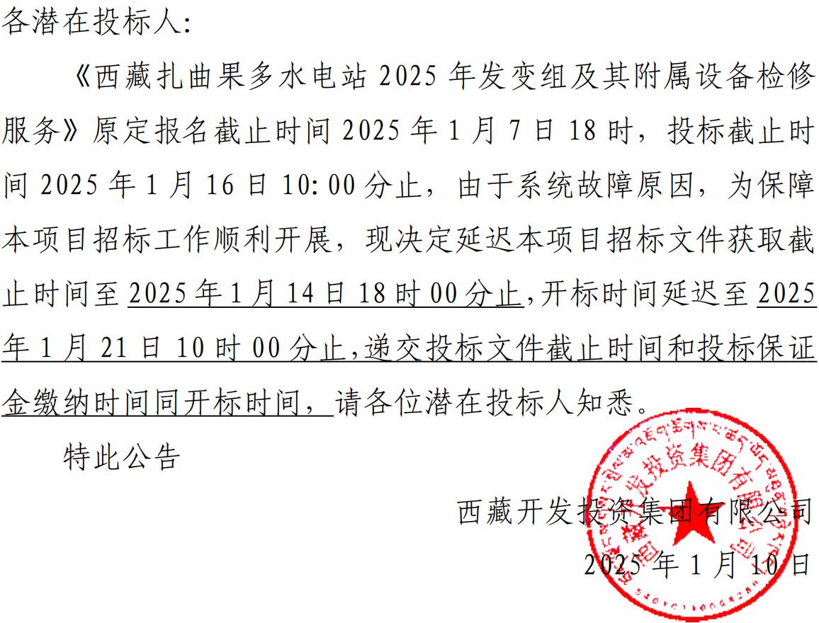關(guān)于延長《西藏扎曲果多水電站 2025 年發(fā)變組及其附屬設(shè)備檢修服務(wù)》報名及投標截止時間的公告