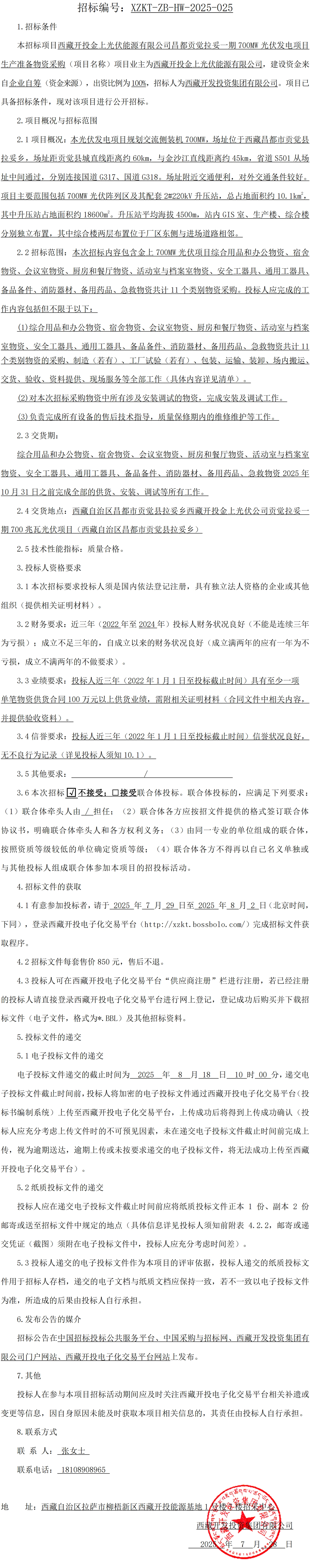 西藏開投金上光伏能源有限公司昌都貢覺拉妥一期700MW光伏發(fā)電項目生產(chǎn)準(zhǔn)備物資采購招標(biāo)公告