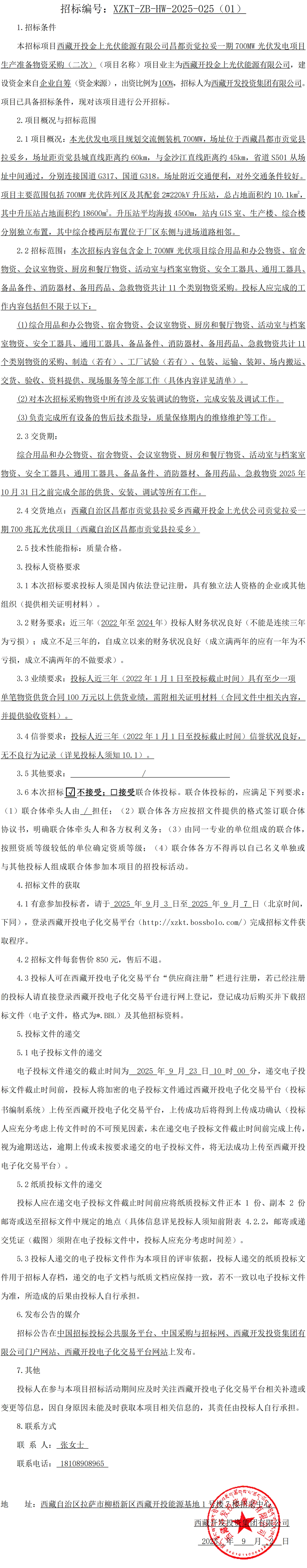 西藏開(kāi)投金上光伏能源有限公司昌都貢覺(jué)拉妥一期 700MW 光伏發(fā)電項(xiàng)目生產(chǎn)準(zhǔn)備物資采購(gòu)(二次)招標(biāo)公告